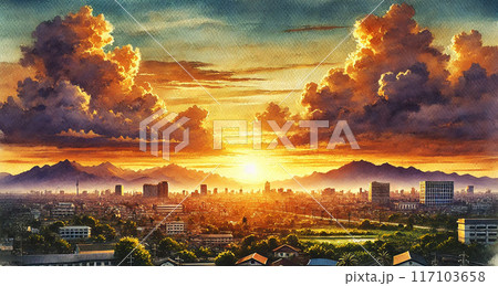 城市景觀,夕陽落在遠處的山上