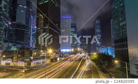 Downtown Dubai towers night timelapse hyperlapse. View of Sheikh Zayed road with tall skyscrapers.