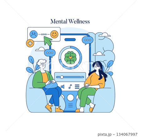 Mental wellness concept featuring two individuals engaging in a supportive discussion. Vector illustration highlights positive emotions with symbols related to mental health and well-being.