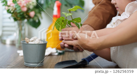 Family Gardening and Eco-awareness. A collaborative moment as a child and adult plant together.