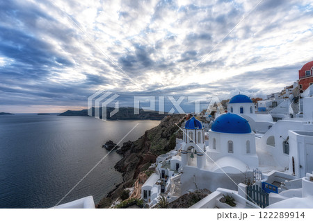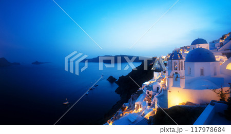 Beautiful sunset over white church of Oia, Santorni, Greece