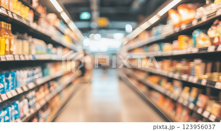 A blurred view of a grocery store aisle with shelves stocked with various products on both sides, creating a sense of depth and focus on the central walkway.