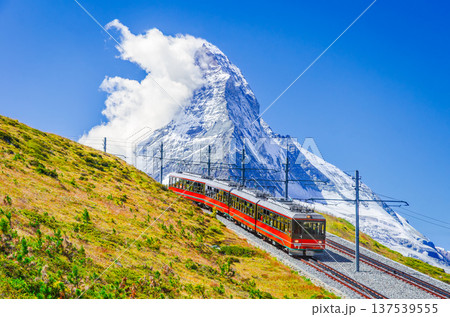Zermatt, Switzerland. Gornergrat railway and Matterhorn pyramid-like mountain.