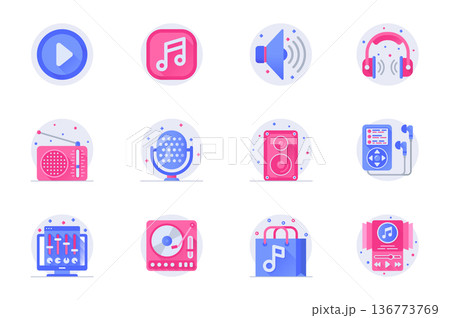 Music and radio station concept of web icons set in simple flat design. Pack of audio, play, note, volume, headphones, microphone, speaker, player, equalizer and other.Vector pictograms for mobile app