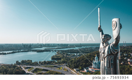 Aerial view to the Beautiful landscape city Kiev with a Dnepr river. Top view to the Motherland statue in the Kiev. The well-known landmarks in Kyiv. Historical monument of Soviet union. .
