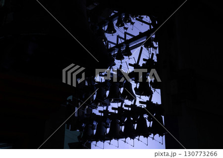Various of bells inside of the bell tower of St. Michael's Golden-Domed Monastery against night sky. Orthodox Easter bells ringing. Kyiv, Ukraine.