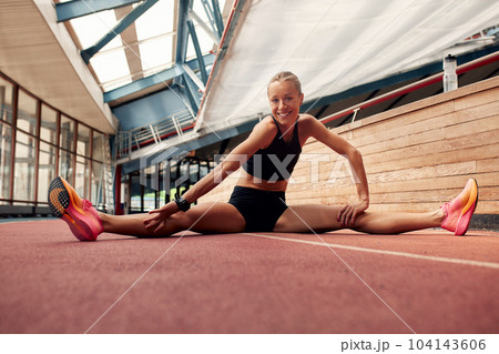 A young athlete girl is warming up before training at the stadium. A slender blonde in a black tracksuit stretches her leg muscles and sits on a splits. Sports and recreation.