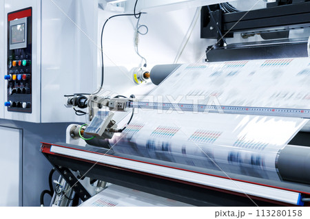 new innovative technology of automatic label printing machine with digital control panel. printing on continuous plastic film for wrapping on food product packaging in the printing factory.