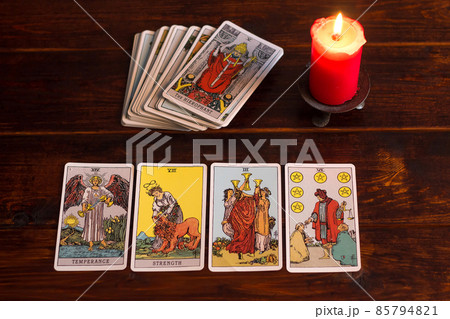 Bangkok,Thailand,March.15.20.On the table are fortune-telling tarot cards and lighted candle.Magic sessions with clairvoyance cards.Reading maps by candlelight