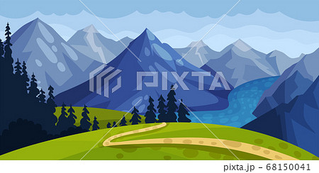Mountain Landscape with Distant Peaks and Green Hill with Winding Path Vector Illustration