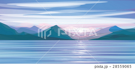 Vector sea sunset, mountains background.