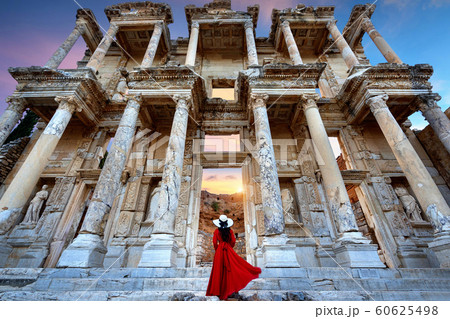 Woman standing in Celsus Library at Ephesus ancient city in Izmir, Turkey.