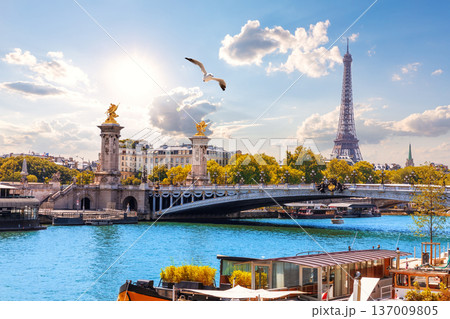Front panorama of Alexandre III Bridge with Eiffel Tower and tour Boats on the Seine River, Paris, France