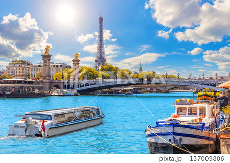 Front view of Alexandre III Bridge with Eiffel Tower and tour Boats on the Seine River, Paris, France
