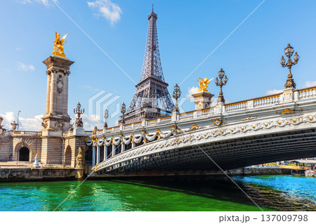 Alexandre III Bridge over Seine river with Eiffel Tower st sunny day, Paris, France