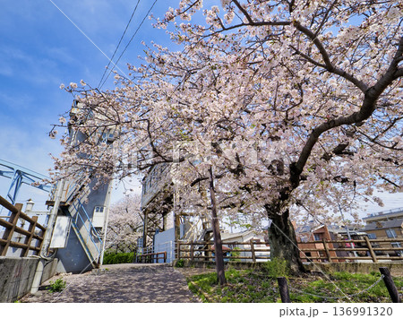 河邊櫻花盛開的景色。