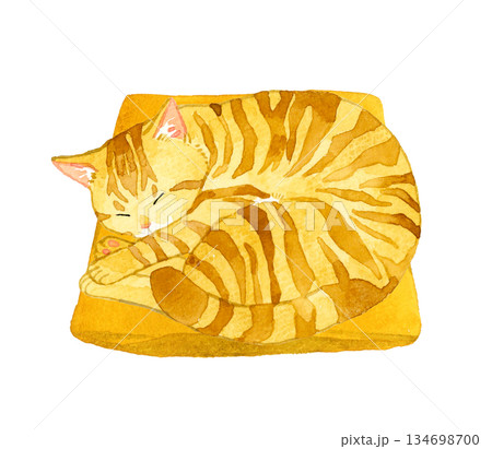 一隻棕色虎斑貓蜷縮在墊子上睡覺。手繪水彩寵物動物插畫。