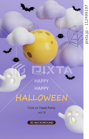 3d Happy Halloween background. white ghost cute with the moon, cloud and bat. Halloween concept. Traditional October holiday. copy space. 3d render.