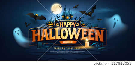 Happy Halloween text design, ghost, bat flying pumpkins, candle, moonnight, banner design