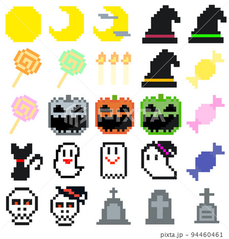 Y2k Halloween 8 bit pixel game icons and stickers set. Vector pixel art Halloween holiday pumpkin, ghost, witch and skull, black cat, bat and spider, scary zombie, skeleton and cemetery tombstone icon