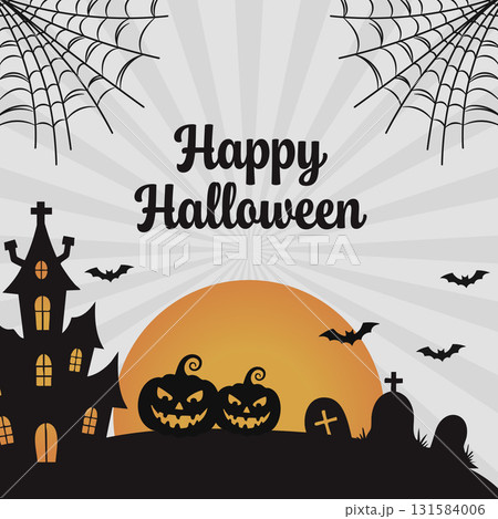 Happy Halloween Greeting with Silhouette Haunted House Gravestones Jack O Lantern Spider Web Moon Bats and Starburst Background Illustration.Vector Illustration