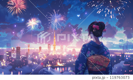 穿著浴衣的女人看著城市夜景和煙火的插圖