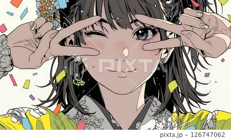 一位身穿浴衣的年輕女子做出和平手勢
