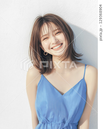 一位身穿藍色洋裝的女子在白色背景下格外引人注目。一位年輕女子正在享受夏季時尚