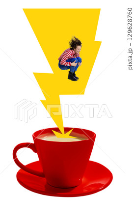Bold poster. Smiling woman crouching inside yellow lightning bolt above red coffee cup on white background