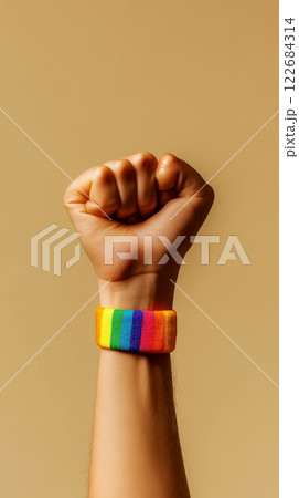 A single clenched fist Raised fist with LGBT flag bracelet, isolated on background, activism, solidarity, equality, pride.