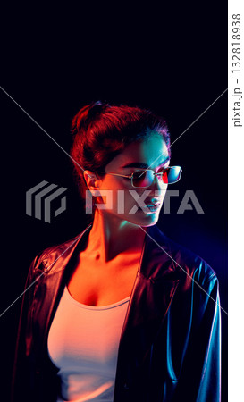 Woman in red and blue light wearing slim sunglasses and leather jacket