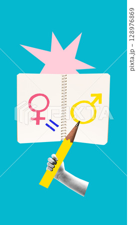 Colorful poster. Notebook with gender symbols and equality sign held by hand on blue background