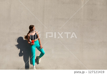 Fit woman enjoying a refreshing drink while resting on outdoor steps, showcasing healthy lifestyle and fitness dedication in vibrant attire. Workout concept