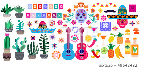 Cinco de Mayo elements set. Sombrero , maracas, flag garland. Mexican Festival traditional items. Vector flat hand drawn illustration isolated.
