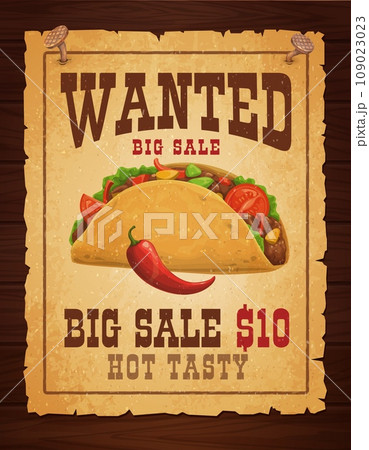 Western wanted poster with Mexican burrito for Tex Mex cuisine menu, vector background. Mexican fast food or restaurant menu or ad poster with burrito wrap and spicy chili pepper on western poster