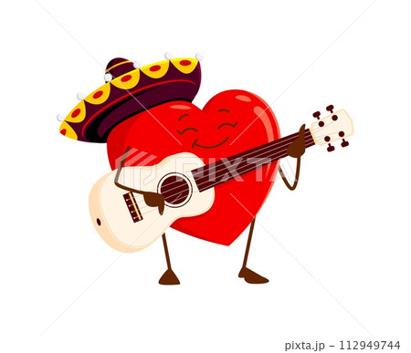 Cartoon love heart musician character in mexican sombrero playing guitar. Isolated vector cute romantic mariachi heart personage celebrate Cinco de Mayo holiday or Valentines day sing romance serenade