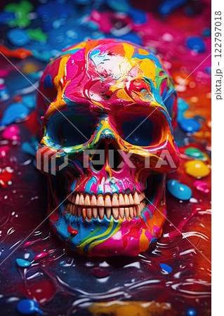 Skull painted and decorated for the Day of the dead ( Dia de los muertos ) holiday celebration. Generative Ai