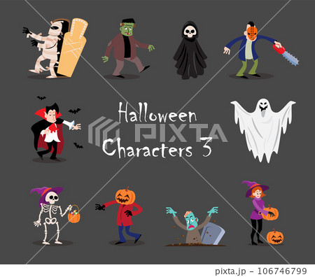Halloween cartoon characters . Gray isolate background . Vector . Set 1 of 4 .