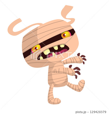 Cartoon funny walking mummy character design. Vector illustration of monster wrapped in strips of linen for Halloween party theamed decoration isolated