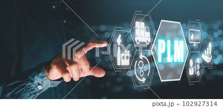 PLM, product lifecycle management concept, Business person hand touching product lifecycle management icon on virtual screen, program development, Technology, Internet and network.