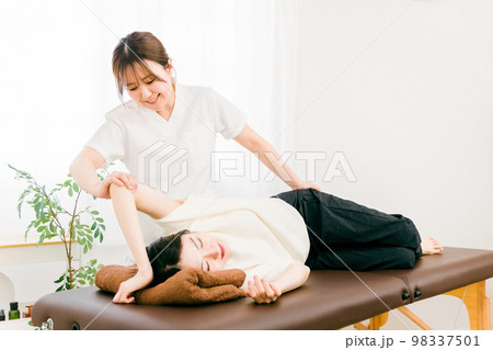 接受推拿、按摩和身體護理以及推拿治療師/治療師(肩膀僵硬)的女性