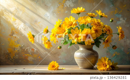 A beautiful autumn still life features a vibrant bouquet of yellow chrysanthemum blossoms and pink daisy flowers in a decorative vase, capturing the colorful nature of a garden bloom