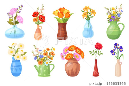 Cartoon bouquet in vases. Spring field flowers in glass jug or ceramic vase, fresh garden flower stem cute wildflowers bunch blossom tulips iris lilly set neat vector illustration