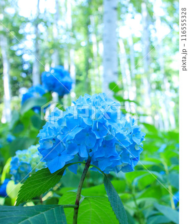 藍色繡球花和白樺樹