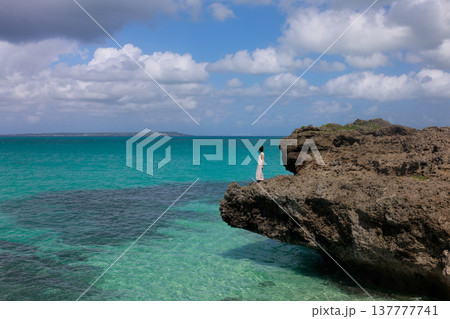 一位女子站在岩石上,凝望著碧綠的海。