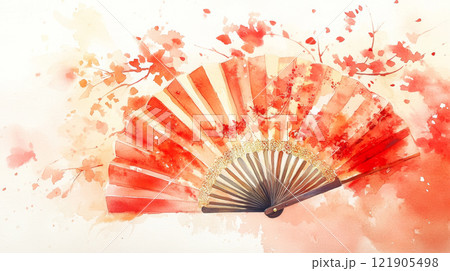 Elegant watercolor painting of red fan with floral accents for Chinese New Year
