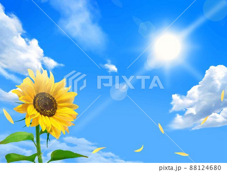 新鮮的初夏框架背景材料,美麗的向日葵在陽光下綻放,在藍天白雲中綻放