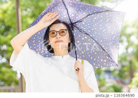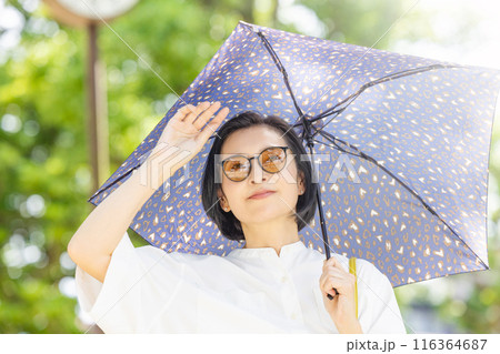 撐著陽傘在公園散步的中年婦女