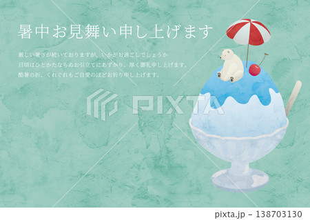 以刨冰和北極熊為主題的夏季賀卡設計,背景是清爽的夏日景色。