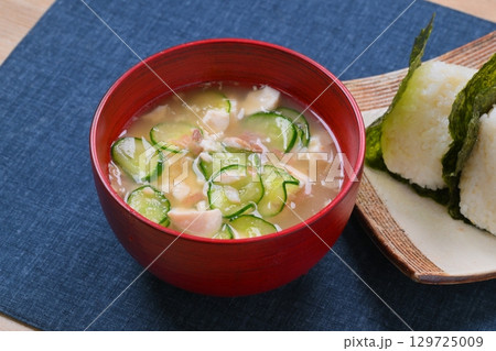 冷味噌湯飯糰,冷味噌湯,鄉土料理,夏季料理,冷味噌湯。配料有黃瓜、竹莢魚乾、豆腐、茗荷。